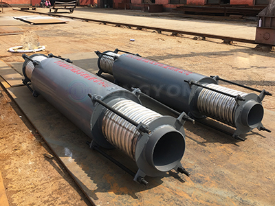 如管道需要對補償軸向和橫向組合位移時,拉桿的兩端應增設球面、錐面墊圈。由于波紋管需要承受內壓,波紋數量受到柱穩(wěn)定性的限制,其長度較小,能夠補償較小的橫向位移。由于受到拉桿的約束,波紋補償器一個工作波紋管和平衡波紋管之間的距離在整個工作歷程不變,當管道受到熱膨脹時兩個工作波紋管受到壓縮,平衡波紋管拉伸,吸收管系的軸向變形。拉桿端部的球面、錐面墊圈及螺母在約束壓力推力的同時,允許拉桿傾斜,使波紋管可以吸收到橫向位移。拉桿、端板應能承受壓力推力所引起的力和力矩。波紋補償器端口處的拉桿承受壓力推力所引起的力和力矩,同時還應能夠承受作用在工作波紋管內徑與平衡波紋管內徑之間環(huán)面上的內壓載荷。